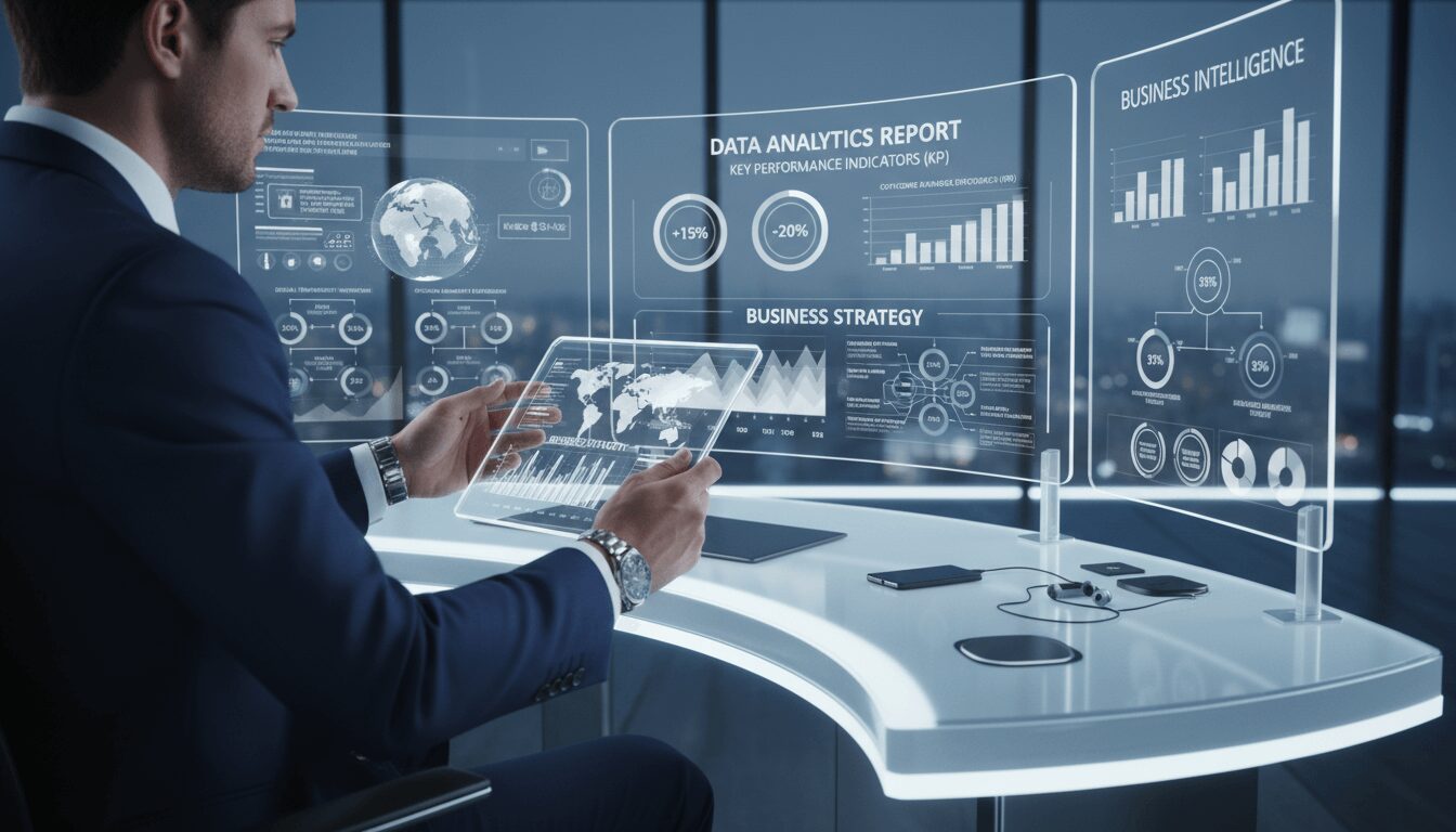 未来のオフィスで透明ディスプレイを操作しデータ分析を行うビジネスマン 2025年11月05日 カテゴリー: IT・テクノロジー、ビジネス・オフィス タグ: #AI、オフィス、パソコン・スマートフォン 画像をダウンロード « 前の投稿